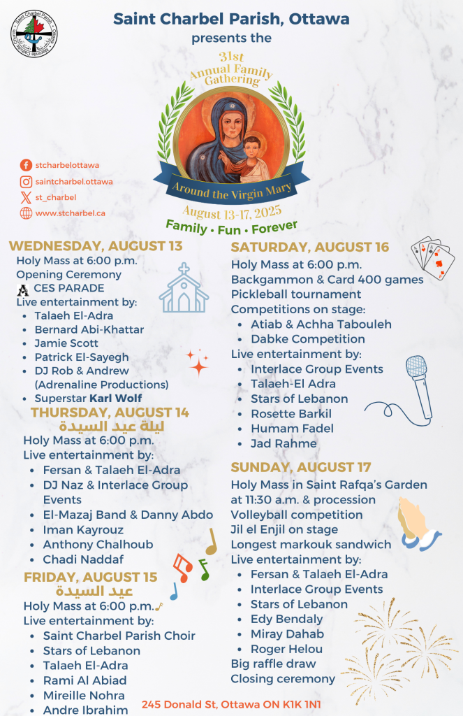 Year after year, thousands of people gather at Saint Charbel Parish, Ottawa, to celebrate the Annual Family Gathering Around the Virgin Mary, particularly as it marks the day of the Virgin Mary’s Assumption into Heaven.